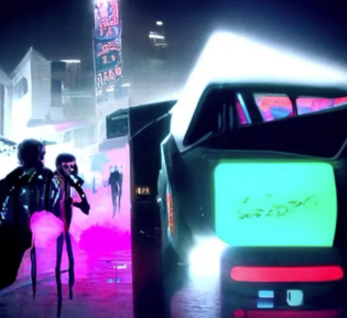 In this piece, the prompt “1980s music scene” was given, and a “cyberpunk” style was chosen: