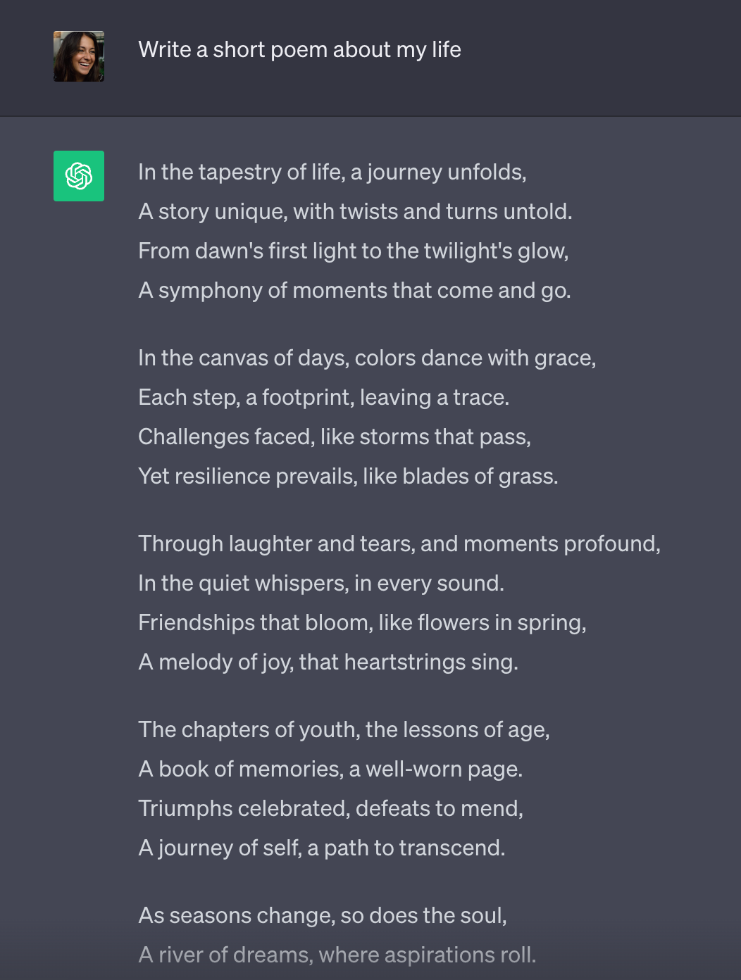 Let’s see how these two examples play out in ChatGPT. For the first result, we didn’t give much context in our original prompt “Write a short poem about my life.”