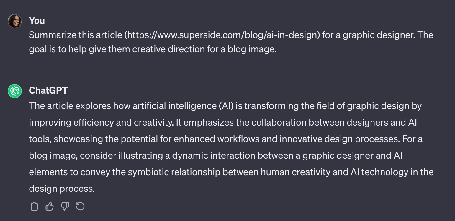Summarize conversations (like transcripts) or pieces of content with ChatGPT. When working with designers, this can be a great way to give designers a quick recap of content, in hopes of driving design inspiration (which you could use to create AI-generated images).