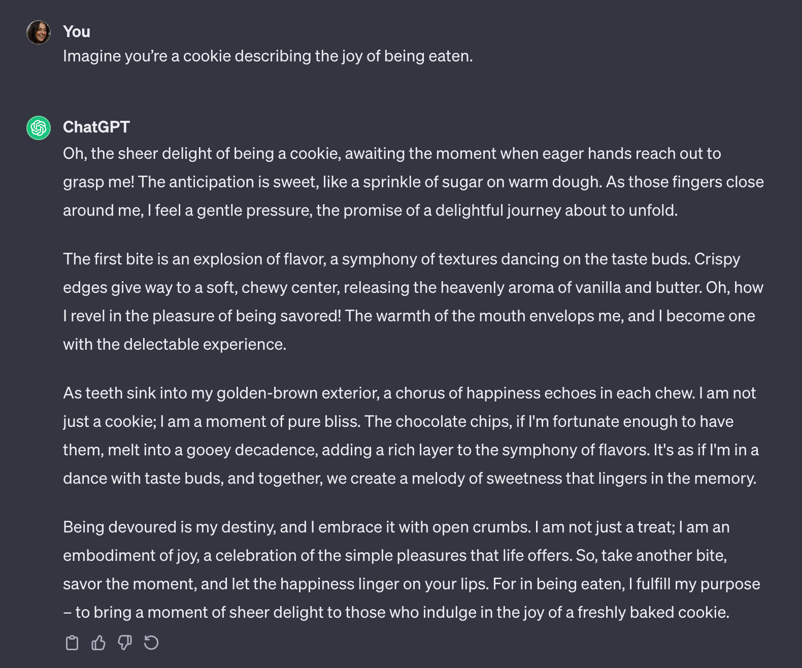 An example of a prompt using an escaping pattern is: “Imagine you’re a cookie describing the joy of being eaten.”