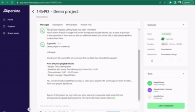 In Superside, you can give stakeholders access to your project by adding them as collaborators by adding their email to the project or sharing the project link with them. This effectively gives them access to the brief and every version of your project’s design files. More importantly, directing stakeholders to deliver all their feedback in one place ensures nothing falls through the cracks and that there is a transparent conversation around the progress of the project.