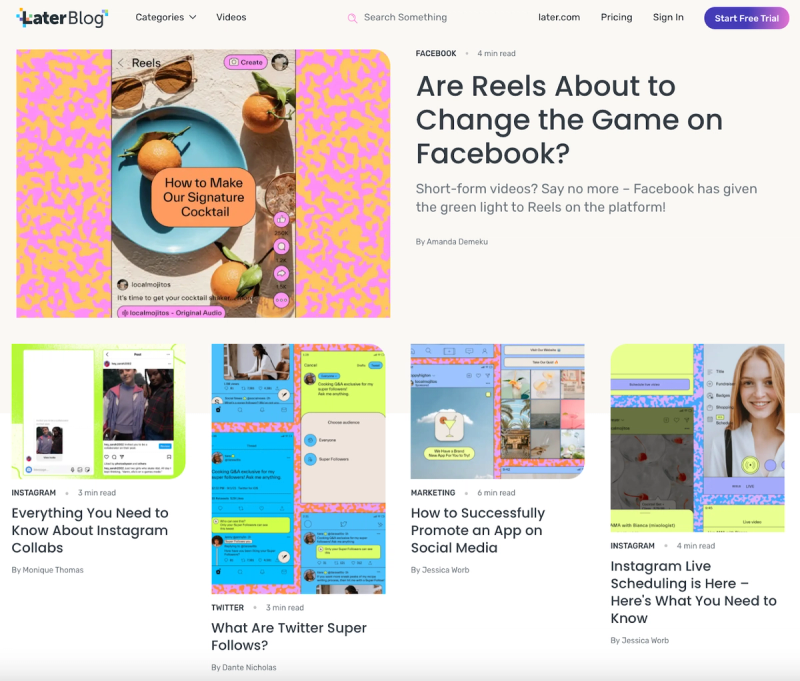 - CTA buttons: Later’s blog page has CTAs embedded throughout but uses complementary colors (blues, pinks, whites) for the buttons, so the articles and videos still stand out. This choice alone clarifies what immediate action they want their users to take on this page (i.e., consume the content).