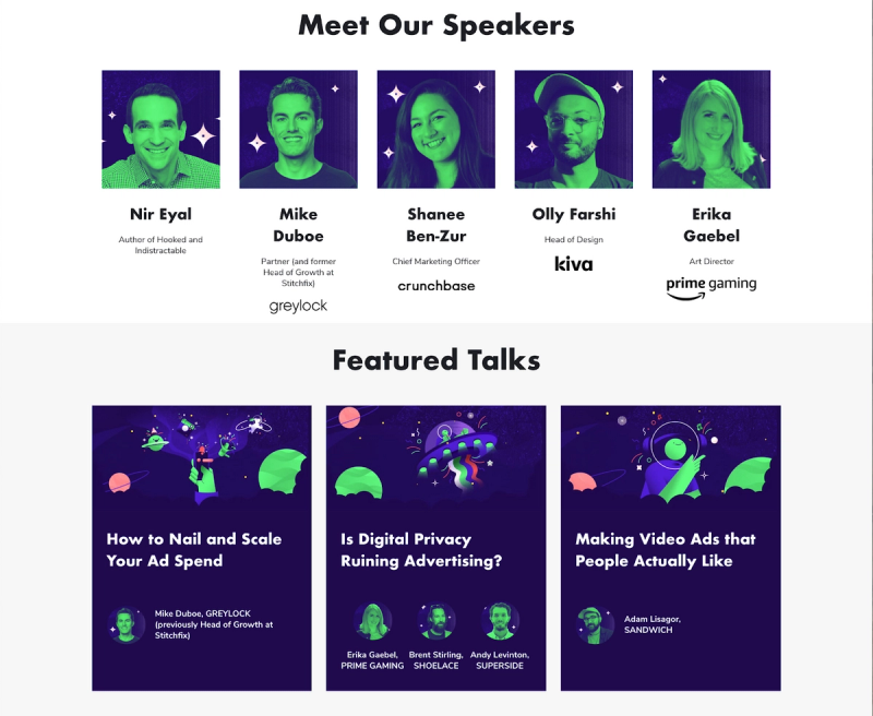 The benefits are the outcomes or results that users will experience by using your product or service. For this offer, the ‘featured talks’ and ‘meet our speakers’ work to articulate the offer’s benefits by giving visitors an idea of what types of talks they’ll hear and who they’ll be hearing from.