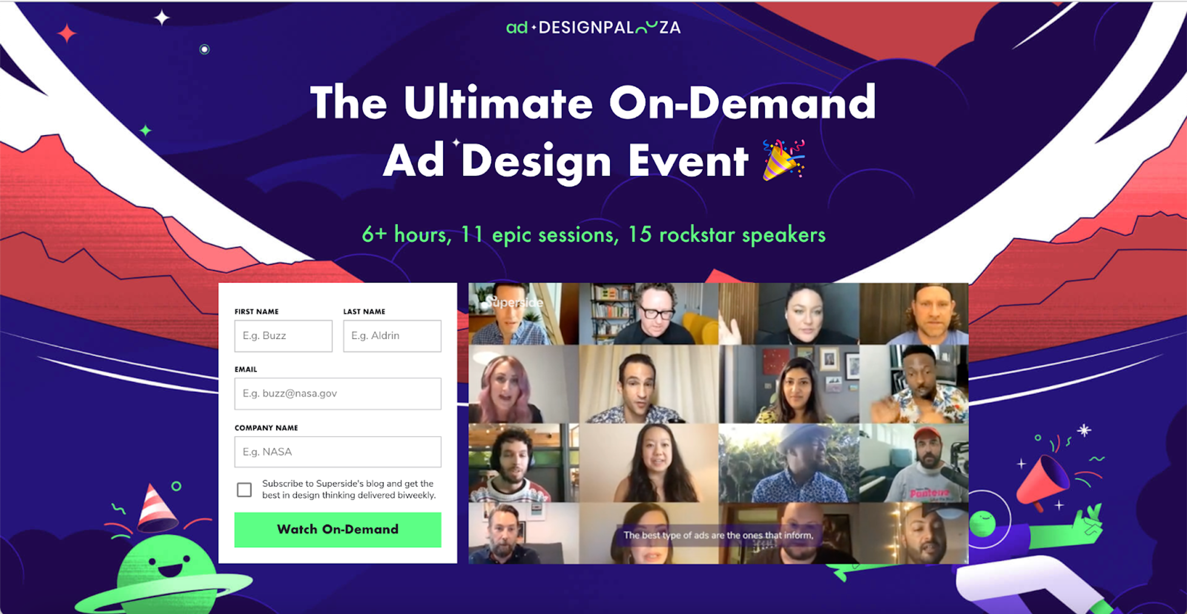 Most effective landing pages follow a consistent structure, but to help paint a picture (and toot our own horn a little bit), we’ll use our very own Ad Designpalooza page as a landing page design example.