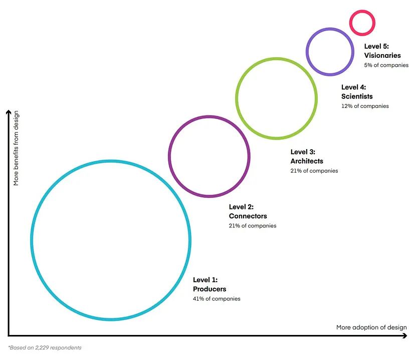 At the higher levels of design maturity, design is no longer about how many ads or videos the creative team is pumping out. It’s about how the company uses design to solve issues that traditionally aren’t thought of as design problems; upholding and emphasizing human-centricity at their core.