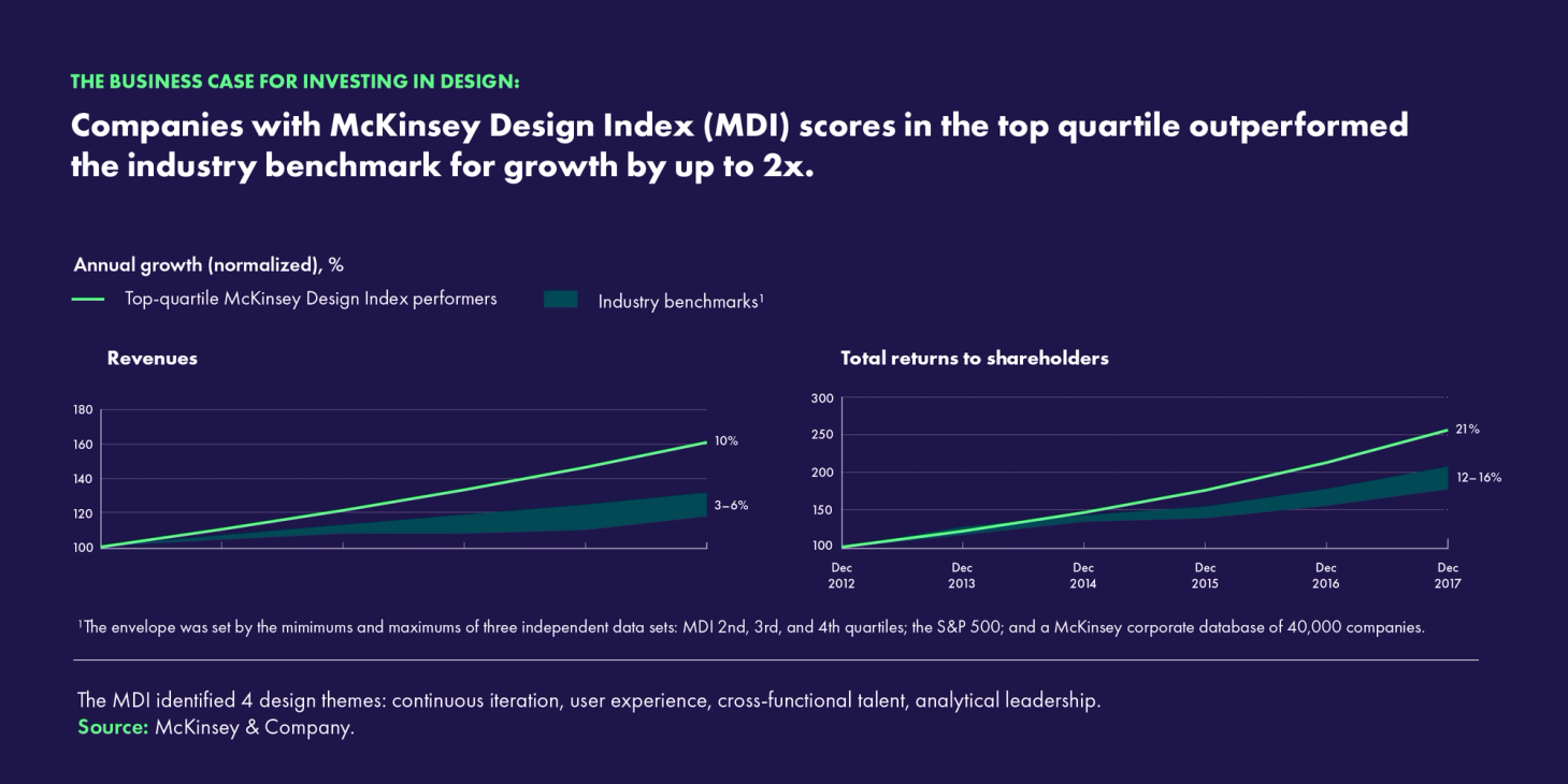 To further cement that last point, we look to McKinsey’s Design Index (MDI) and their study on the business value of design. Top MDI performers (companies who scored high on the MDI scale) saw increased revenue and total returns to shareholders.
