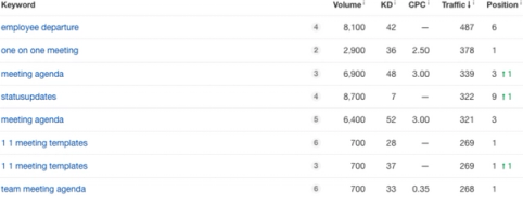 Their search rankings reveal more information about pain points, namely that their highest ranking content among high-volume keywords suggests that they’ve gone all-in on providing solutions to manager pain points such as lack of meeting agendas, employee departure, and making one-on-one meetings more efficient.