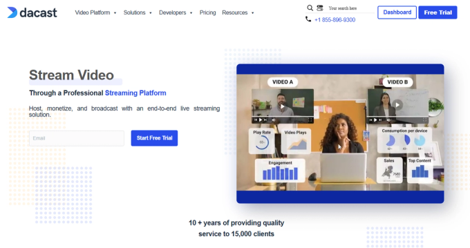 Dacast offers a comprehensive video streaming solution for live streaming and on-demand content. It includes secure hosting, options to make your videos pay-per-view or subscription-based, and a suite of analytics and marketing tools.