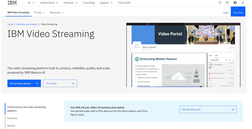 - Best for: IBM Video Streaming offers high storage capacity and supports large audiences, making it an excellent choice for enterprises looking to maximize their video reach.