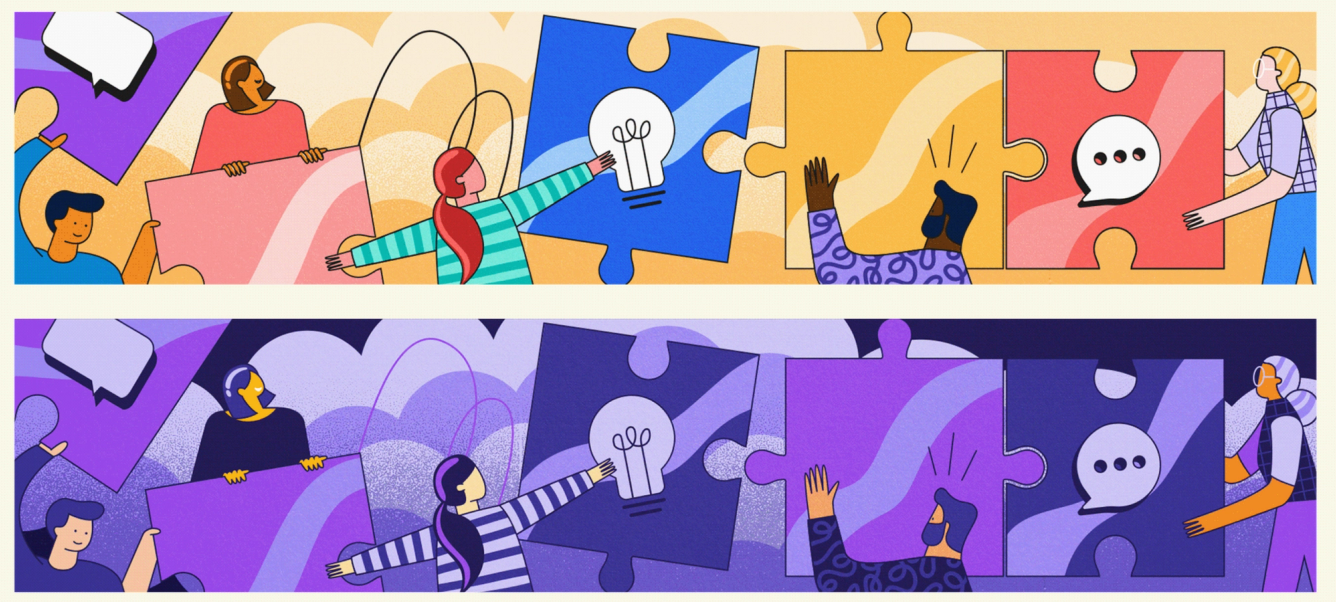 The yellow header (above) communicates collaboration, ideas, dialogue, and teamwork. By tweaking the color palette (below), Adriana Amaya, a Superside Creative Team Lead, is able to communicate all of those ideas but also bring diversity to the foreground. By simply playing with purple hues, the diversity of the characters pops.