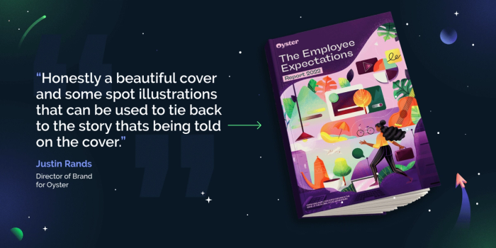 Oyster’s e-book, The Employee Expectations Report 2022, exemplifies this approach to branding. Their brand guidelines are tight but flexible enough to empower their design team to explore interesting possibilities. They made a deliberate choice to illustrate their eBook in a distinct style—one that doesn’t exactly match their core branding.