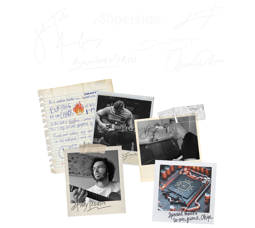 At Superside, we know the creative grind: the deadlines, the 3 AM ideas, the brainstorm marathons. We’ve lived it. That’s why we put together an album that captures the rollercoaster of the creative process, laced with some questionable humor and turbocharged by AI.